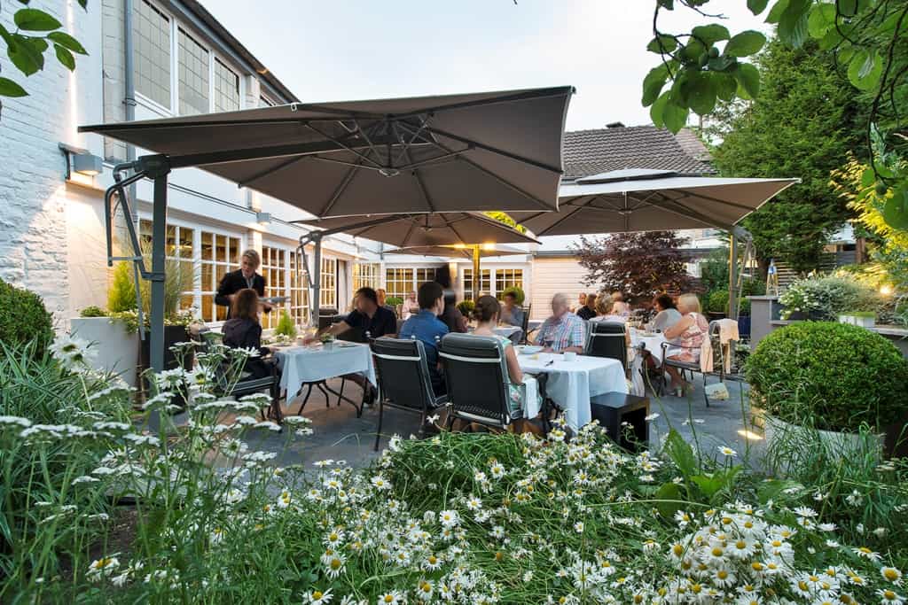 Découvrez la terrasse du Prieuré Saint-Géry, un havre de paix niché dans un cadre verdoyant.